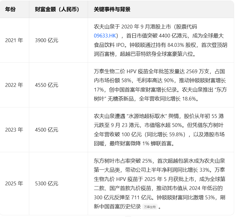 2020年农夫山泉港股上市,首日市值突破4400亿港元,钟睒睒首次登顶首富。2024年虽因舆情危机导致股价腰斩、包装水营收缩水,但凭借东方树叶爆发与港股回暖,2025年财富同比激增1900亿元,创下5300亿元的中国首富纪录。