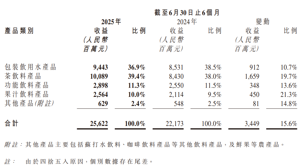 农夫山泉在2025年上演了一场强劲复苏:上半年实现收入256.2亿元,同比增长15.6%;归母净利润76.2亿元,同比增长22.2%。其中:
