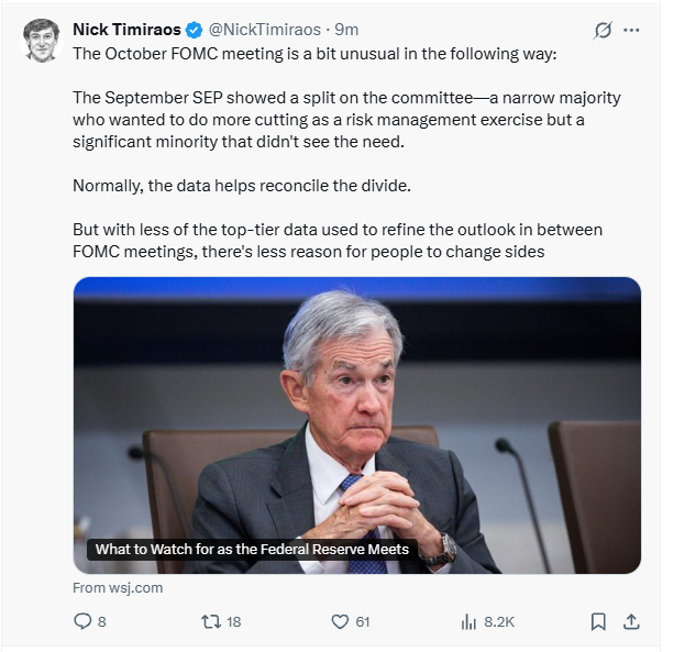 Timiraos分析称,10月会议的特殊性体现在:9月公布的“点阵图”已显示委员们对利率路径存在显著分歧——多数官员倾向于通过继续降息进行风险管理,但仍有相当比例成员认为当前经济环境无需进一步宽松。通常情况下,劳动力市场、通胀等关键数据能帮助调和分歧,但政府停摆导致多项核心指标中断发布,使得委员们缺乏调整立场的客观依据。