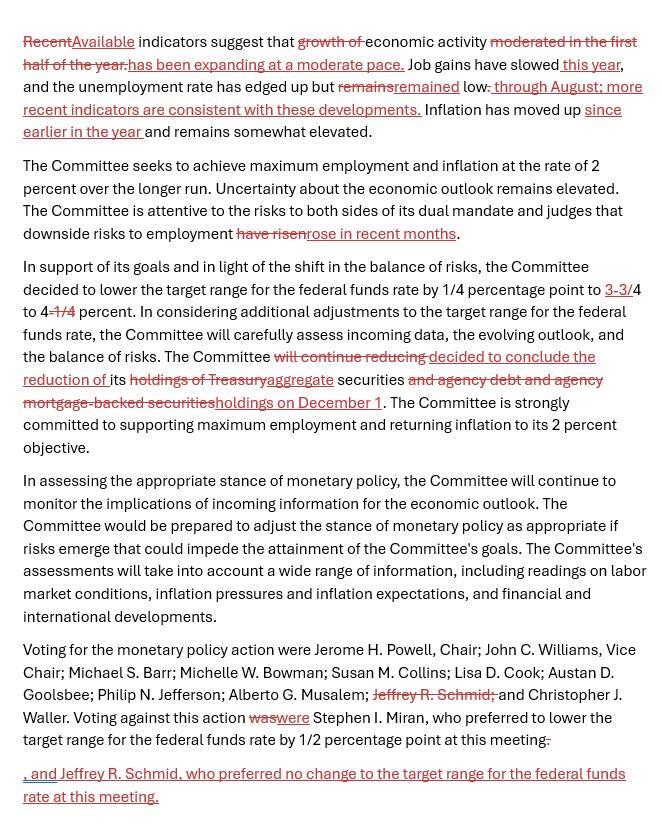 声明还重申,降息决定是“鉴于风险平衡已转变”,并判断近几个月就业下行风险已增加。这一表述与鲍威尔两周前的表态一致,他当时表示,自9月会议以来,就业和通胀前景似乎没有太大变化。