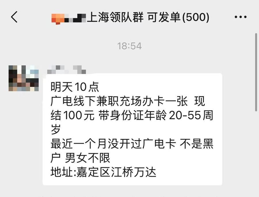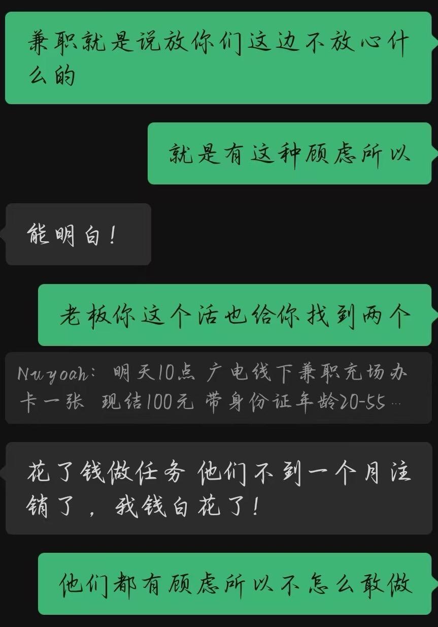 记者联系发布"广电卡充场"的领队,对方称上海地区工作人员未完成冲量任务,因此通过他们招聘。每成功介绍一人,领队可获20元佣金,求职者赚取100元报酬。当记者表达担忧时,对方发来与"号商老板"的聊天记录,试图证明安全性。但当记者继续追问时,其"老师"小九却警告:"类似号卡充场尽量不要去,谁也不知道卡会流向哪里。"