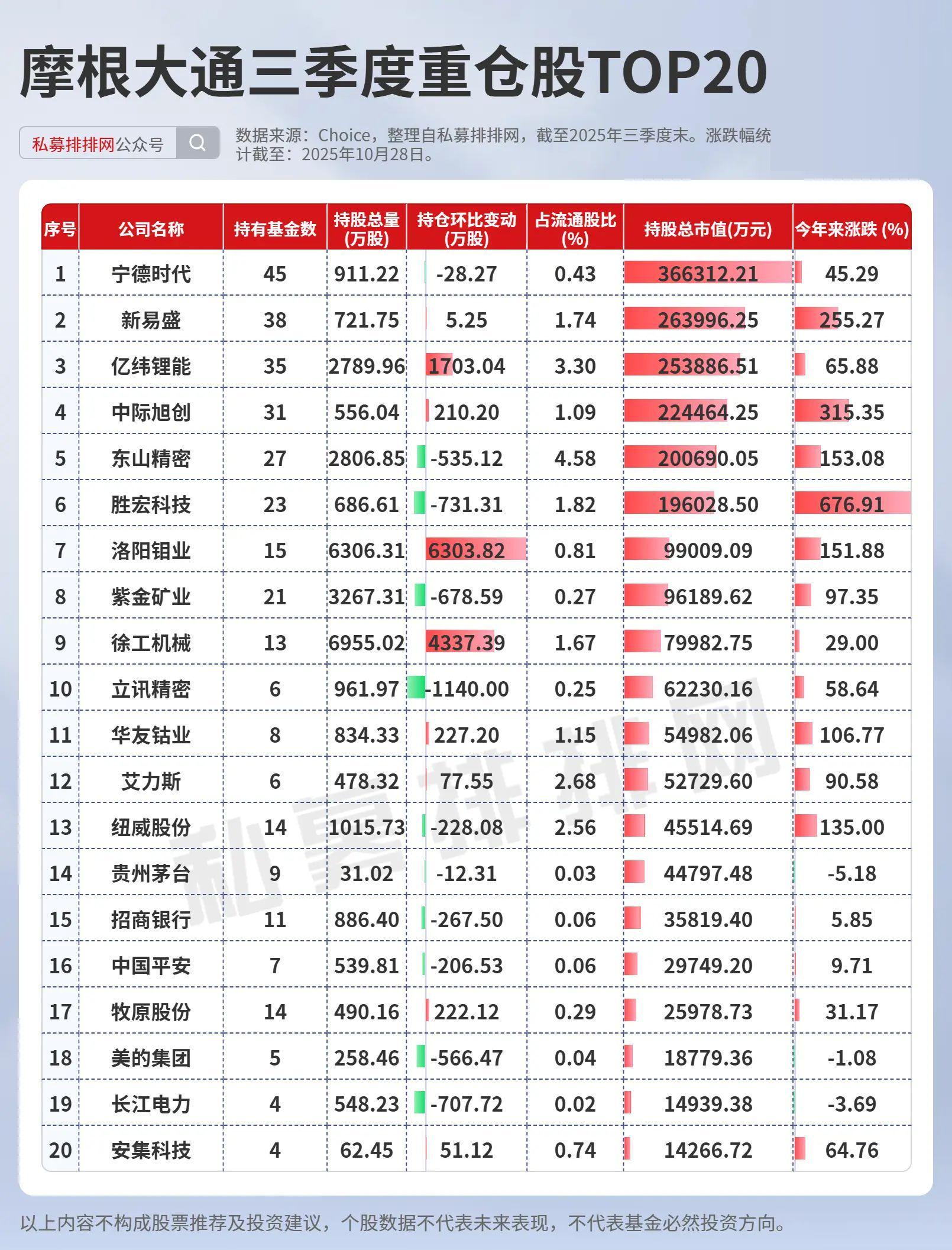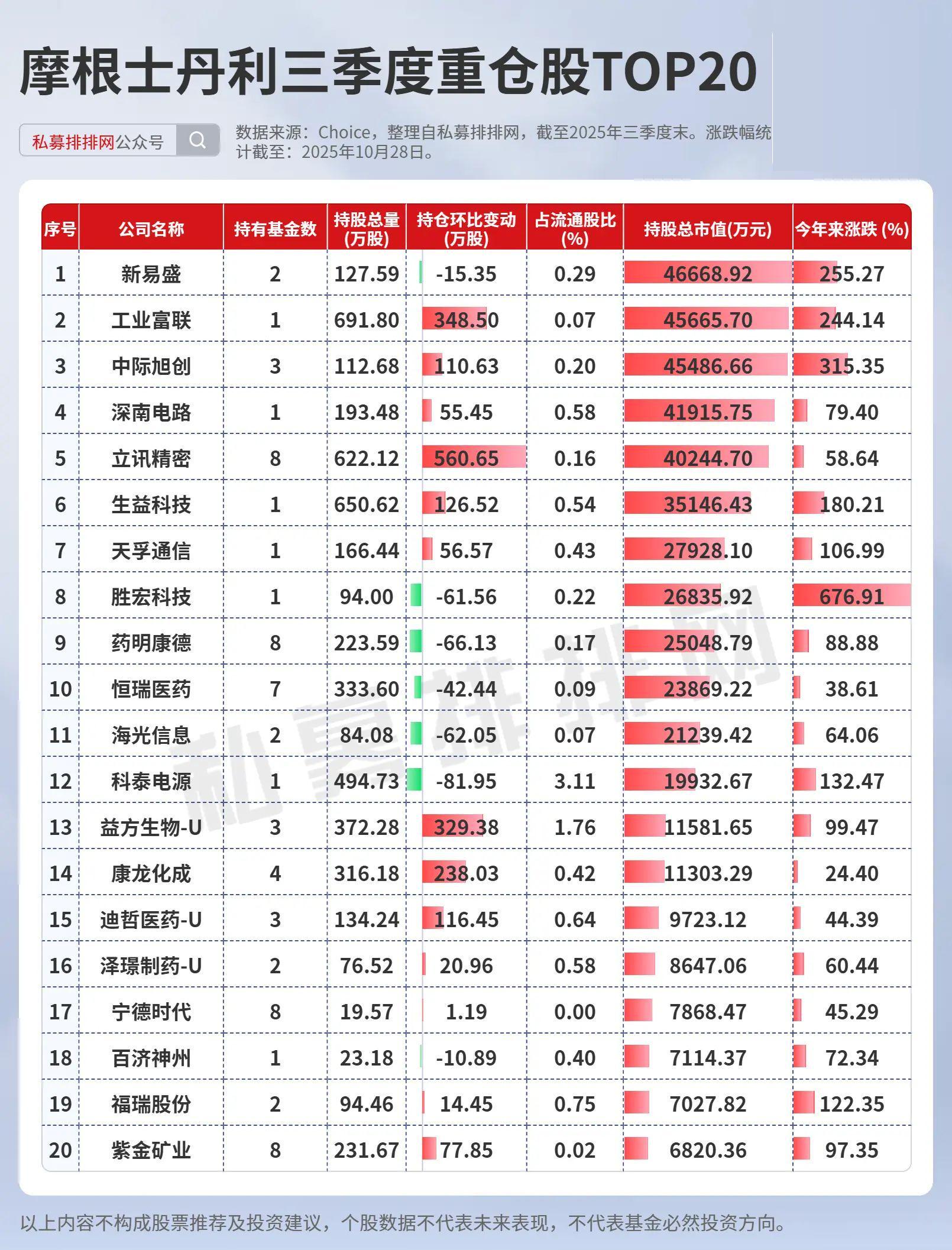 截至三季度末,摩根士丹利基金资产规模达270.04亿元,持有164只标的,合计市值约113.78亿元。其重仓股主要集中在医药、AI等领域,前20大重仓股年初以来平均涨幅达140.35%,其中8只涨幅超100%。