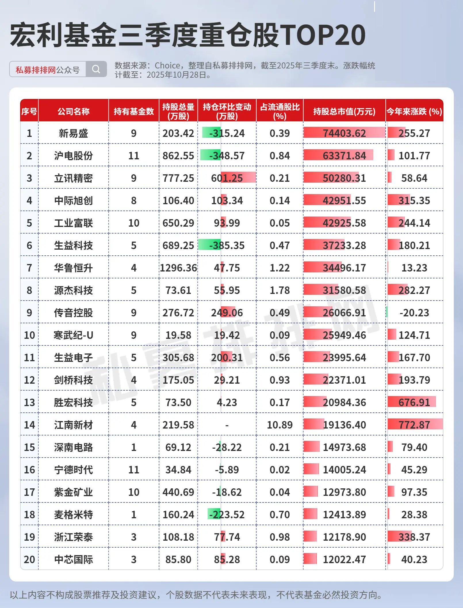 前二十大重仓股中,仅1只微跌,19只涨幅显著,其中12只涨幅超100%。前三大重仓股分别为新易盛、沪电股份、立讯精密。新易盛、沪电股份被减持315.24万股和348.57万股,最新持股203.42万股和862.55万股,市值约7.44亿元和6.34亿元。立讯精密被加仓601.25万股,最新持股777.25万股,市值5.03亿元。