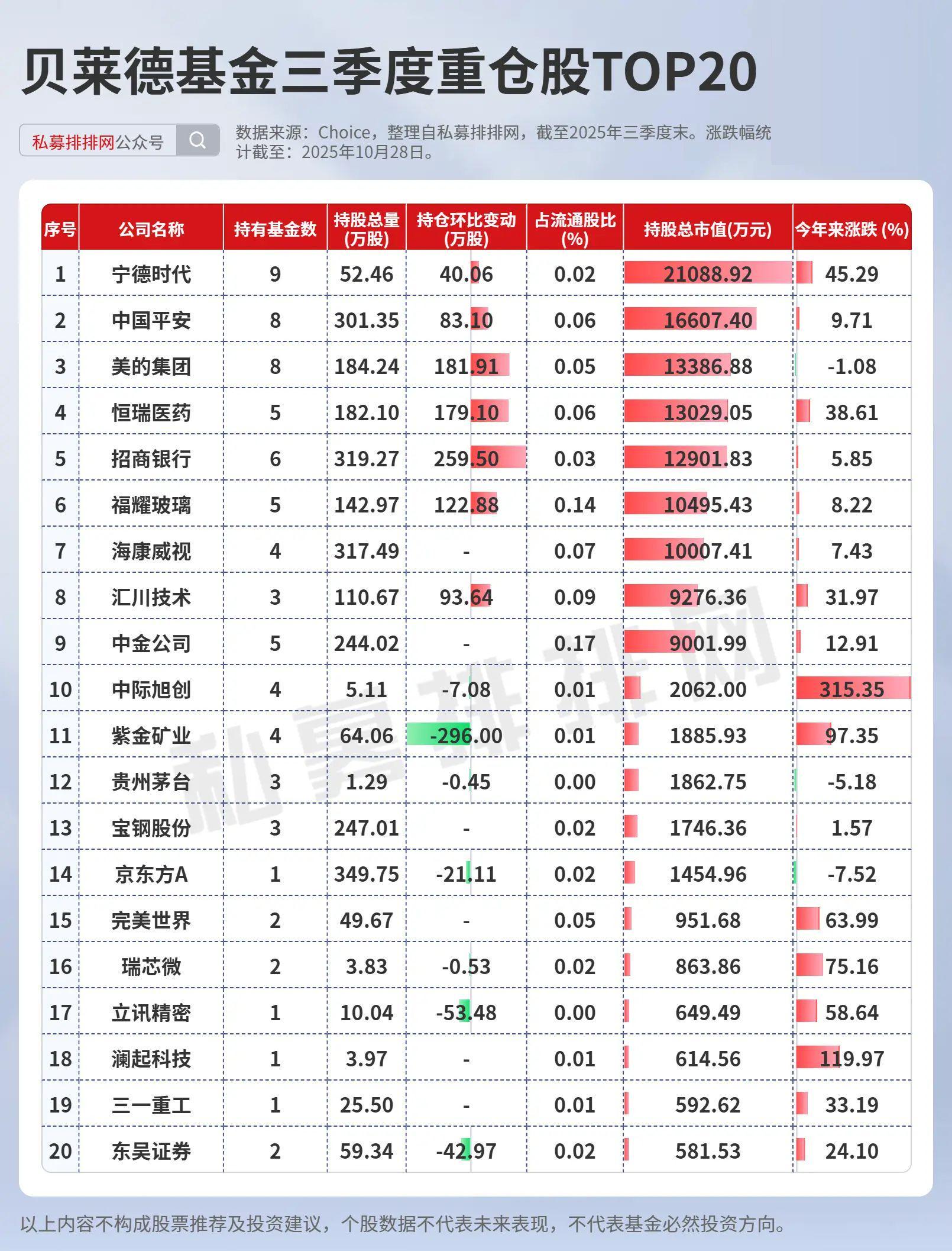 作为中国首家外资全资控股公募,贝莱德基金三季度末资产规模达62.79亿元,持有47只标的,合计市值约32.64亿元。前二十大重仓股年初以来平均涨幅46.77%,其中6只涨幅超50%,7只个股持有市值过亿。