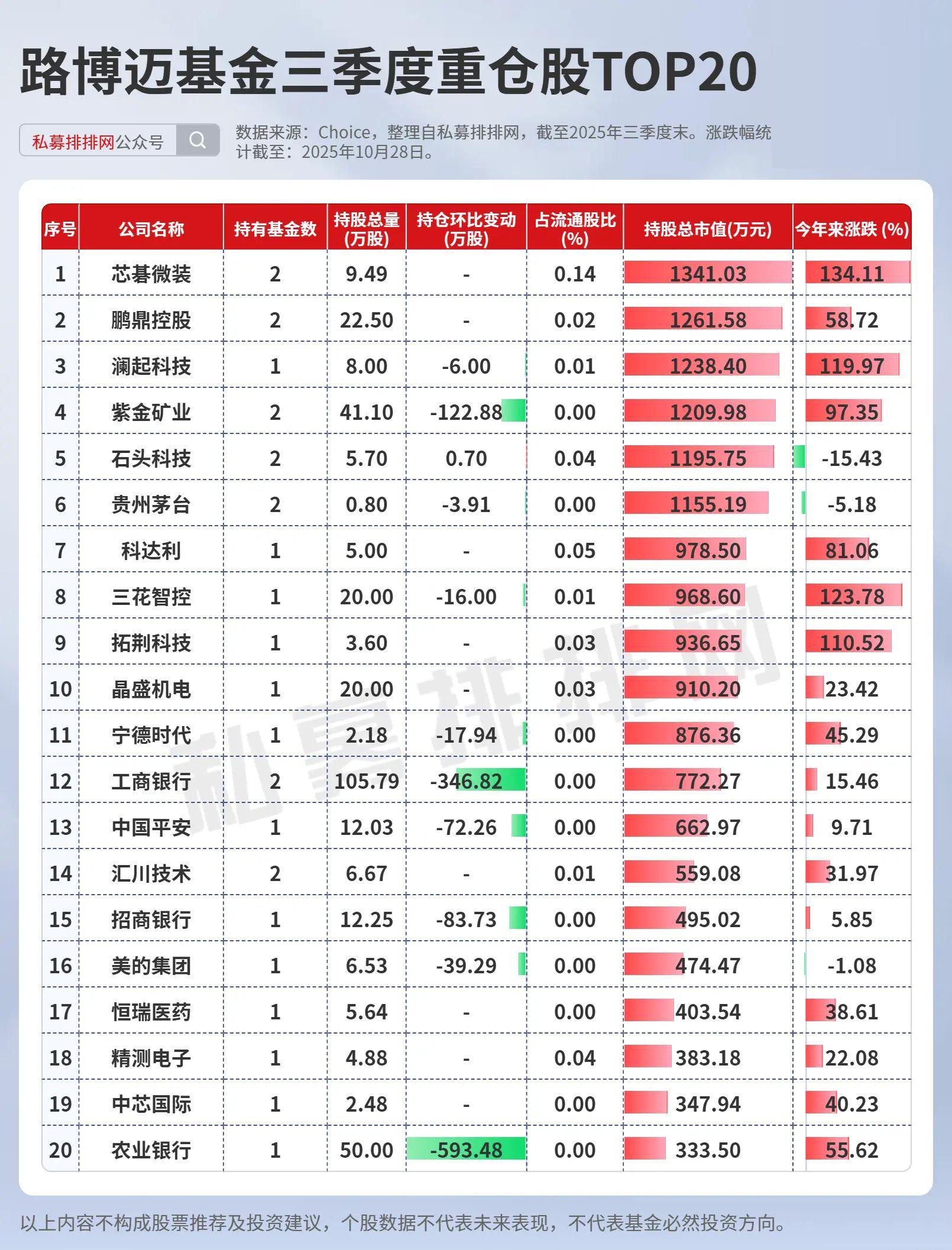 持仓方面,前二十大重仓股年初以来平均收益49.60%。相比二季度,路博迈基金减持了贵州茅台、工商银行等“老登股”,第一大重仓股转为科技股芯碁微装。