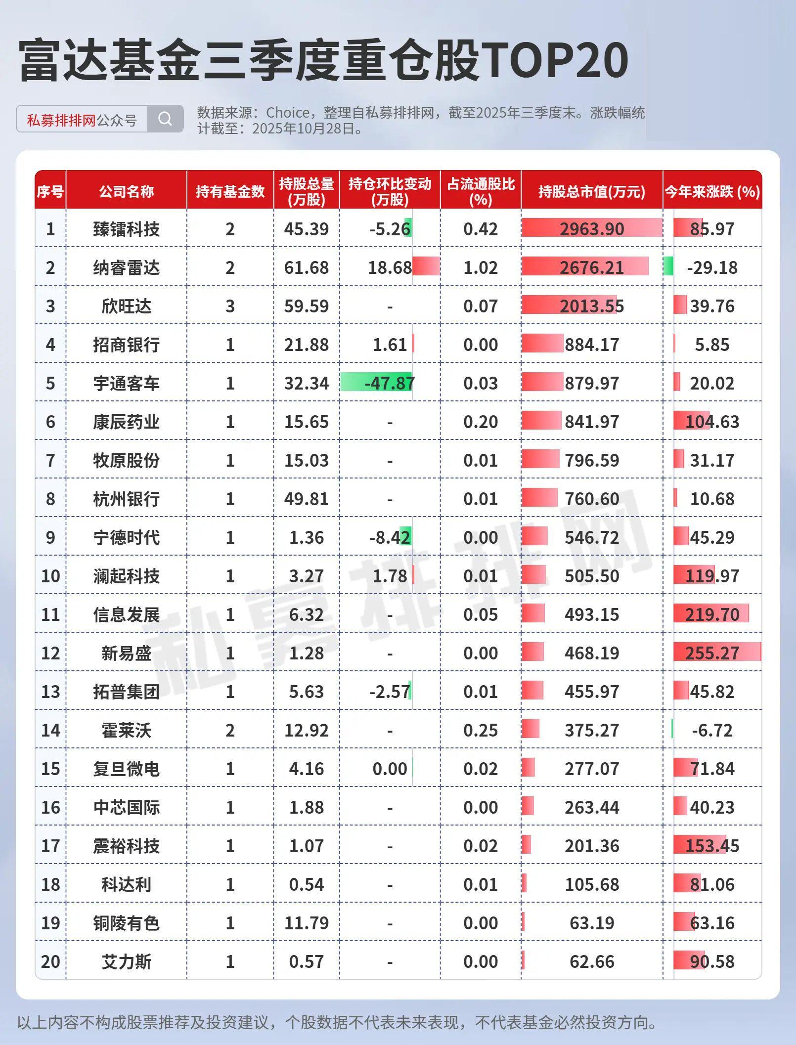 富达基金认为,中国已成为“世界创新者”的有力竞争者,科技股增长潜力更大。截至三季度末,其资产规模达35.94亿元,持有41只标的,合计市值约7.47亿元。前二十大重仓股年初以来平均涨幅72.43%,第一大重仓股为臻镭科技,2只基金合计持有45.39万股,市值约2963.90万元。