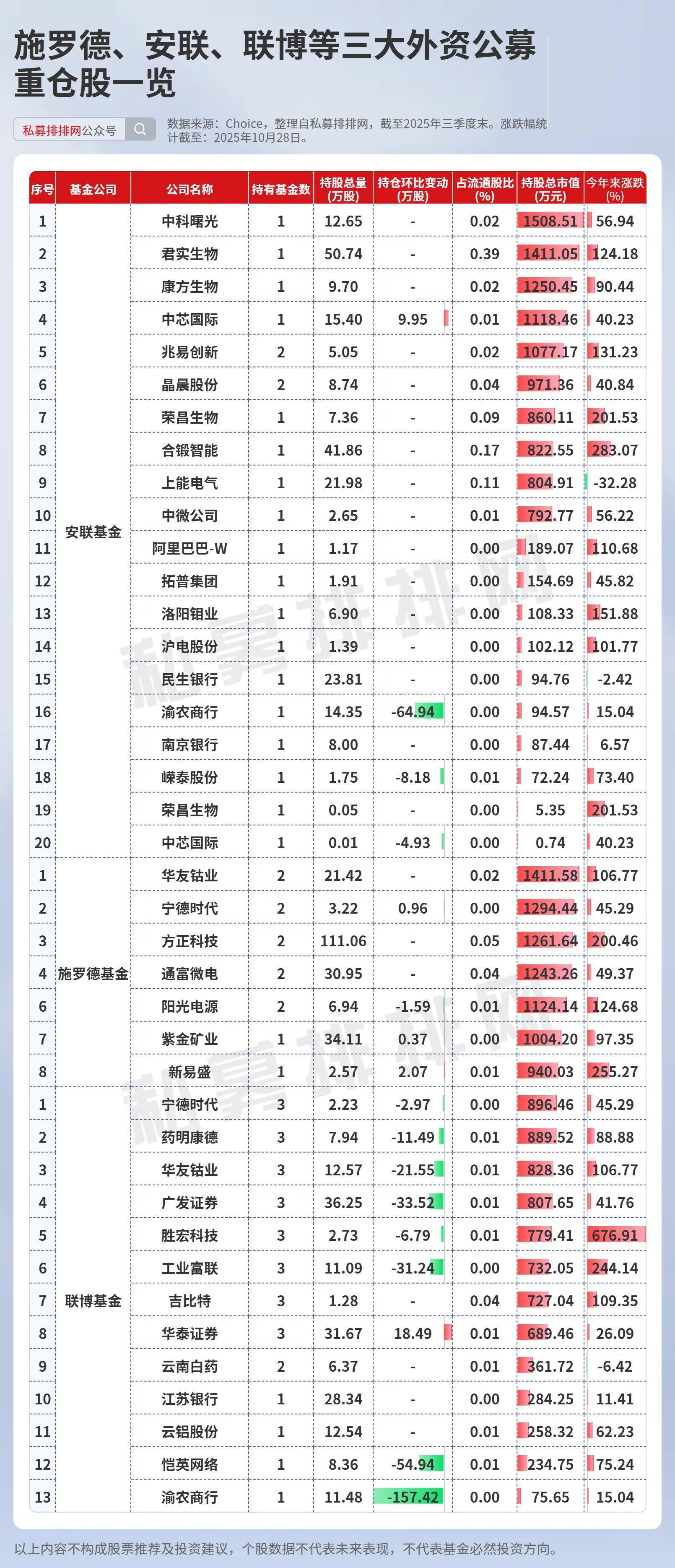 根据Choice数据,三季度共有6家外资公募增持股票,其中安联基金、施罗德基金的股票市值增长率分别高达77.10%和82.03%。从持仓方向来看,AI科技、工业富联、生益科技、胜宏科技等成为热门布局领域。随着公募基金三季报披露完毕,这9家外资公募的重仓股逐渐浮出水面。