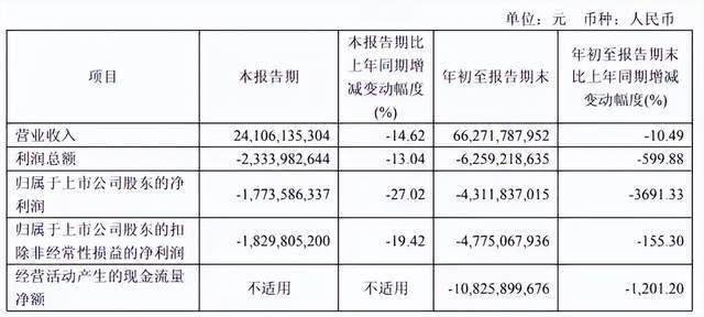 三季度合并营业总收入243.18亿元,环比增长6.98%,同比下滑14.62%;归属于上市公司股东的净亏损17.74亿元,环比收窄但同比扩大3.77亿元。