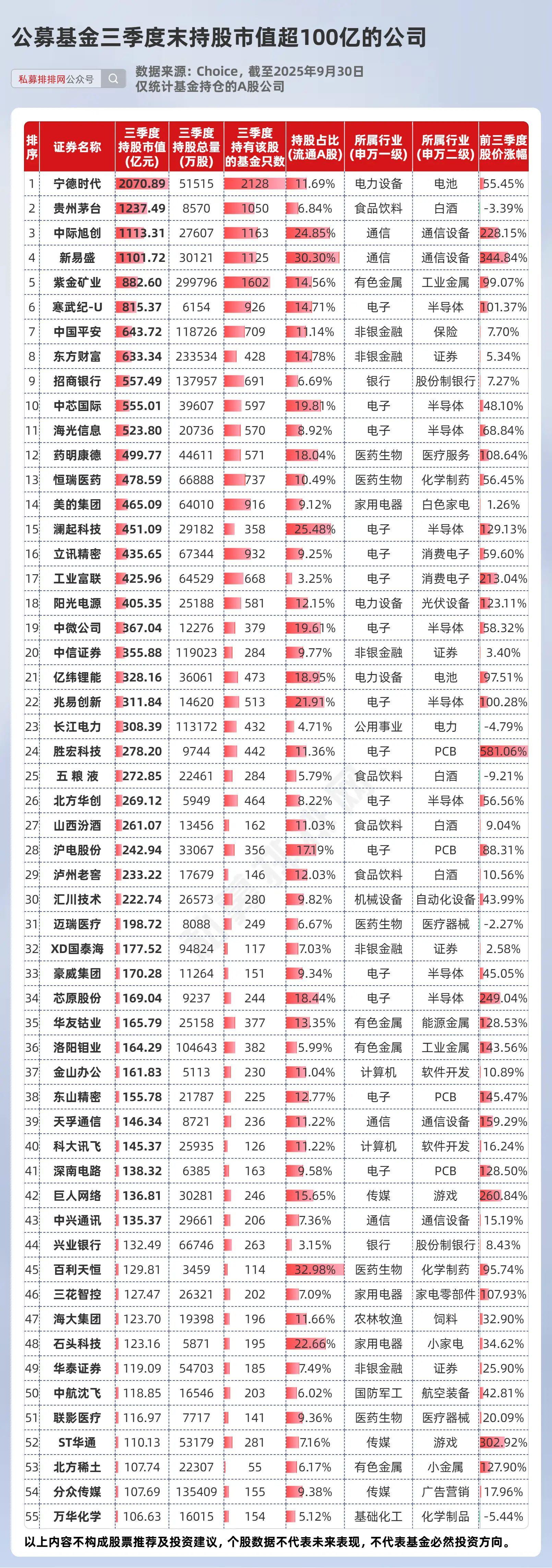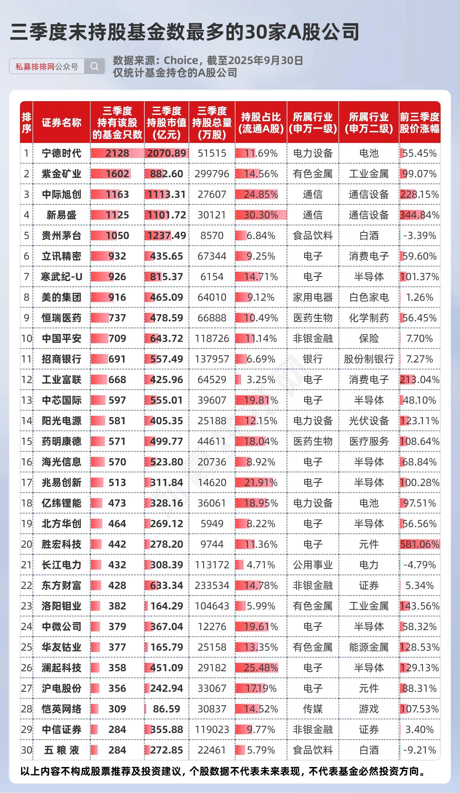 截至2025年10月28日,随着公募基金2025年三季度报告的全面披露,市场关注的最新重仓股名单正式出炉。根据基金披露规则,季报仅展示前10大重仓股数据,而完整持仓情况需待中报与年报发布。(本文数据均基于A股持仓统计)