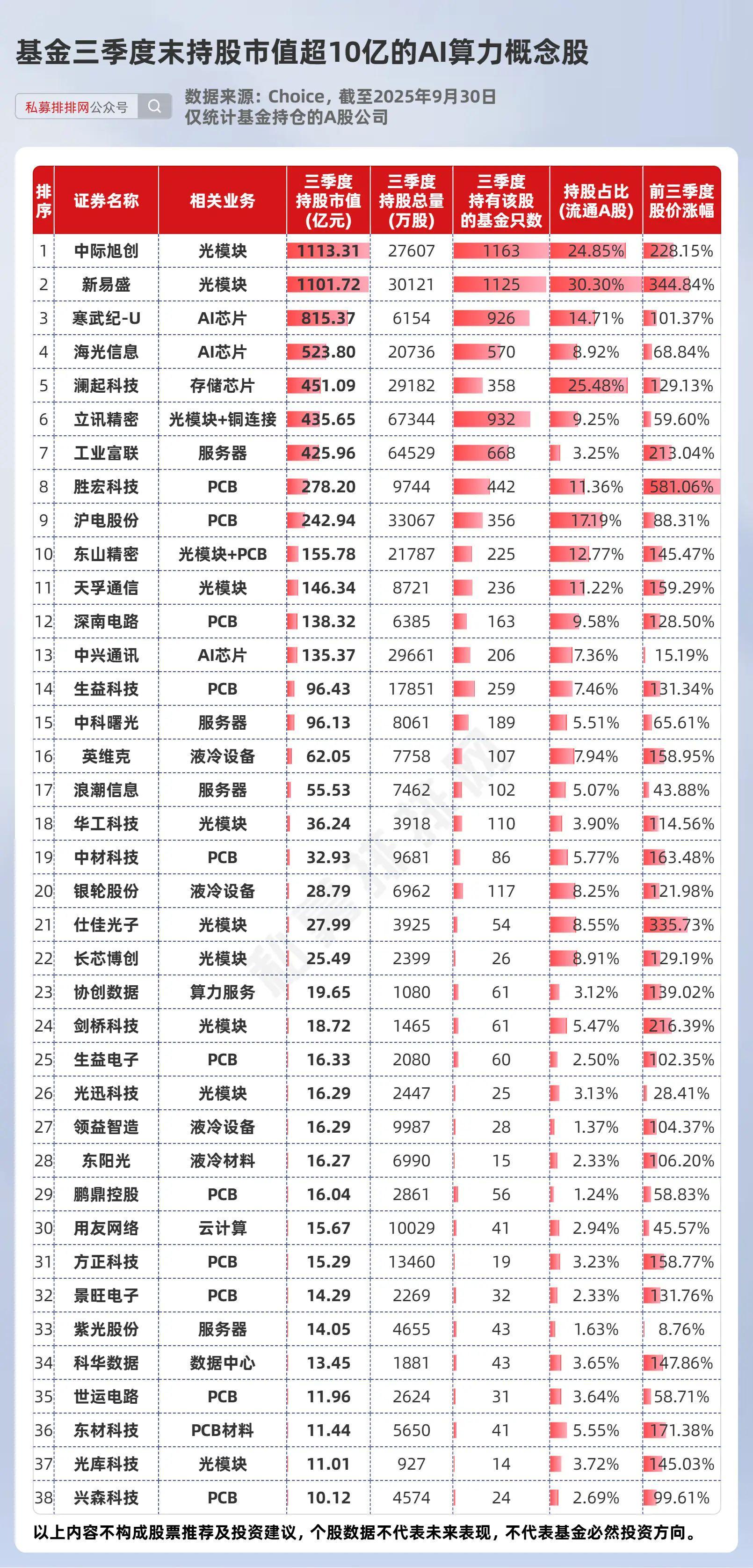 其中,英伟达光模块供应商中际旭创、新易盛均被基金持股超1100亿元,寒武纪、工业富联等11只个股均被基金持股上百亿元。从市场表现来看,这38只AI算力概念股前三季度涨幅中位数约为129%,大幅跑赢同期创业板指,“翻倍股”达26只。其中,PCB龙头公司胜宏科技以超580%的涨幅领涨,共有442只基金重仓该股,合计持股市值超278亿元。