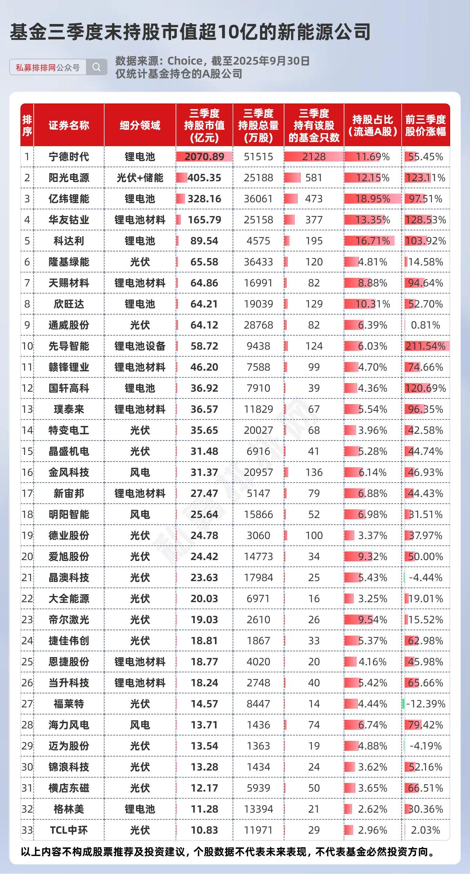 据统计,2025年三季度末,有33只新能源概念股被基金持股均超10亿元。其中,锂电池龙头宁德时代被基金持股超2000亿元,阳光电源、亿纬锂能、华友钴业等个股也分别被基金持股达405亿元、328亿元、166亿元。从市场表现来看,这33只新能源概念股前三季度涨幅中位数约为50%,与同期创业板指表现相当,“翻倍股”占5只。其中,锂电池设备公司先导智能以超210%的涨幅领涨,共有124只基金重仓该股,合计持股市值接近59亿元。