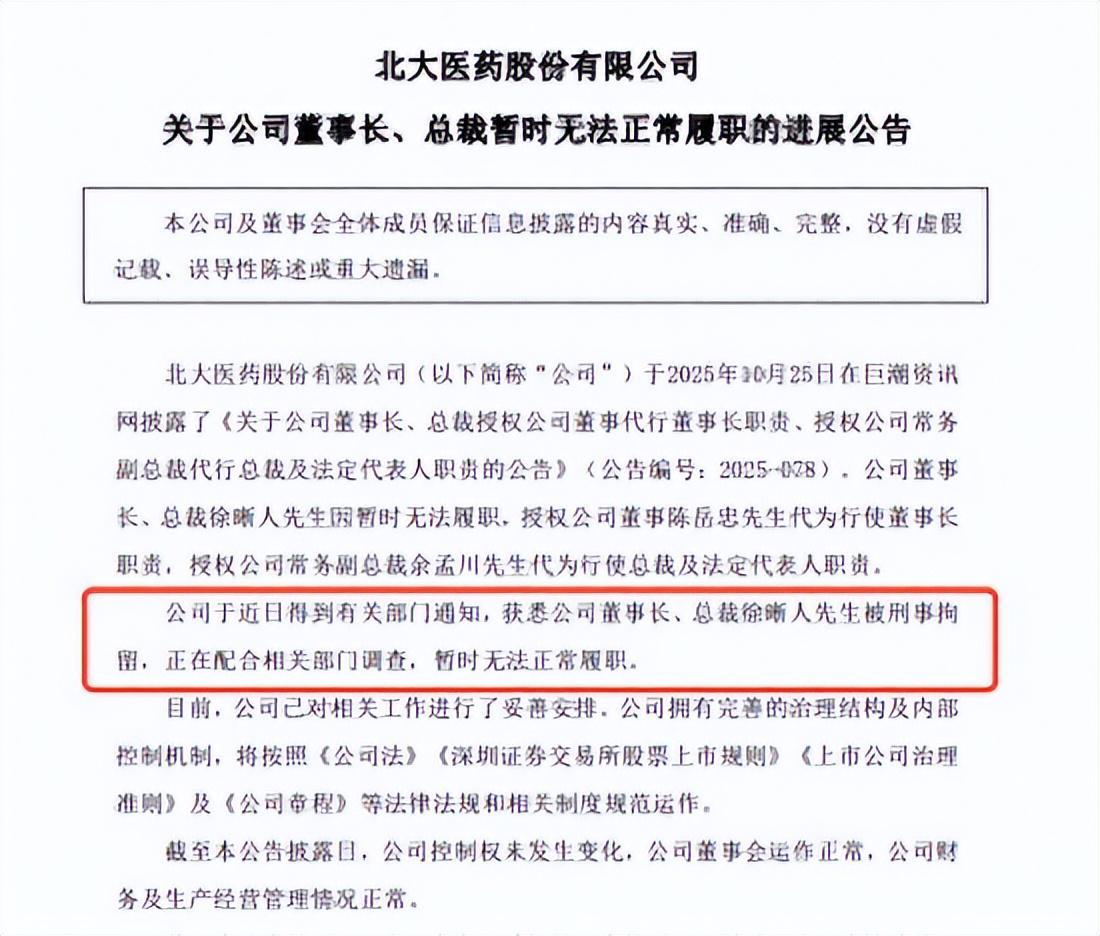 2025年10月30日,北大医药(000788.SZ)突然发布公告,董事长兼总裁徐晰人因配合调查被刑事拘留。此时距离他全面接管公司仅半年时间,这场突如其来的风波将这位资本操盘手推向了舆论的风口浪尖。