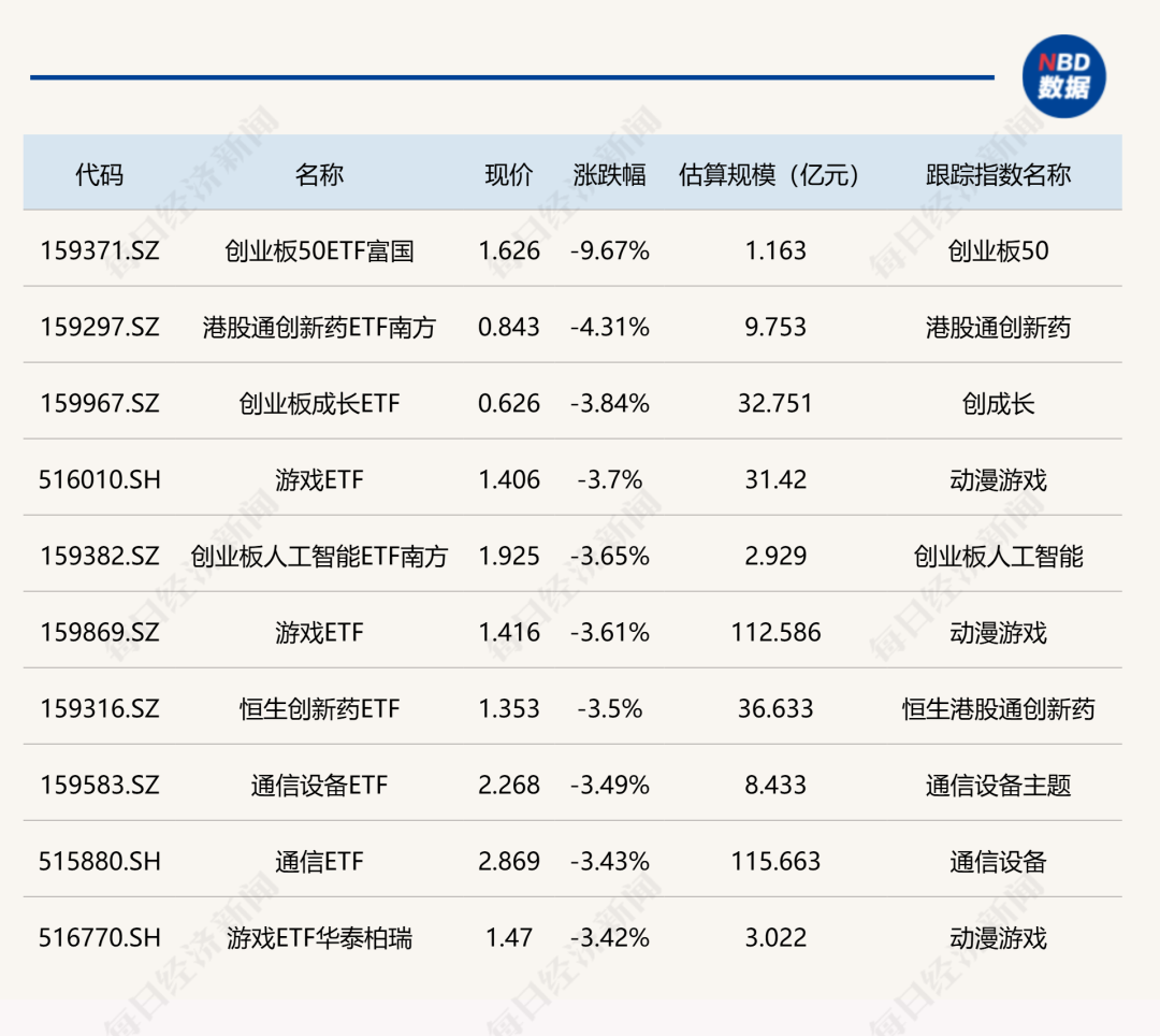 下跌方面,创业板50ETF富国表现不佳,跌幅超过9%,游戏ETF也未能幸免,跌幅超过3%。