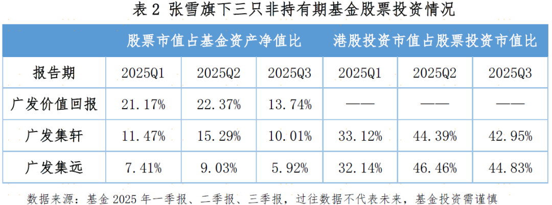 从2025年一至三季度数据看,三只产品股票市值占净值比呈现阶梯特征,低波产品与高波产品仓位差约5%-10%,但加减仓方向和权益配置思路保持一致。例如广发集远和广发集轩作为二级债基,通过港股投资增强收益弹性;广发价值回报则通过A股配置平衡风险收益。