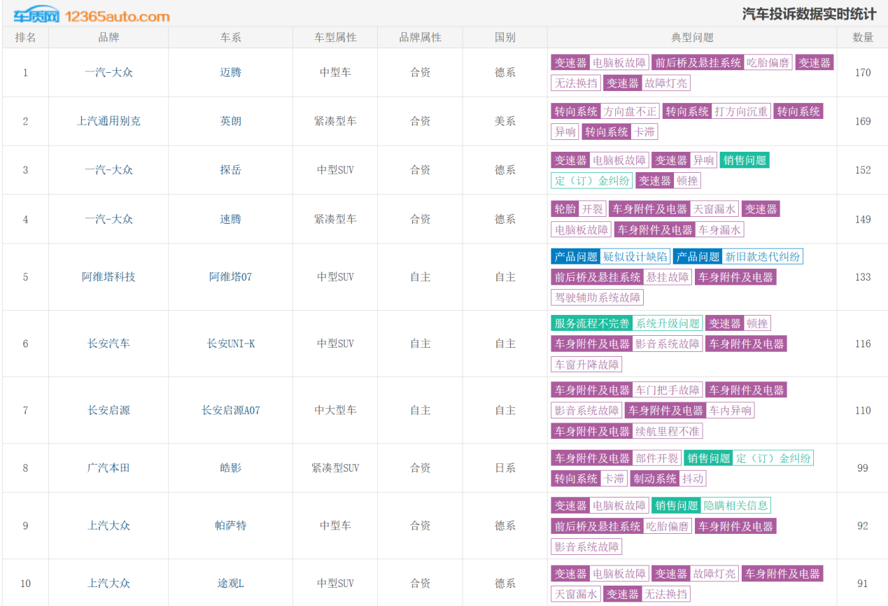 社会维度表现暴露出明显短板。车质网近30天投诉数据显示,上汽通用别克英朗因转向系统故障高居投诉榜第二位,方向盘偏移、转向卡滞等问题直接影响行车安全。上汽大众两款车型则深陷变速器异响、顿挫等硬件缺陷。这些集中于动力总成、底盘系统的质量问题,反映出质量管控体系可能存在系统性漏洞。