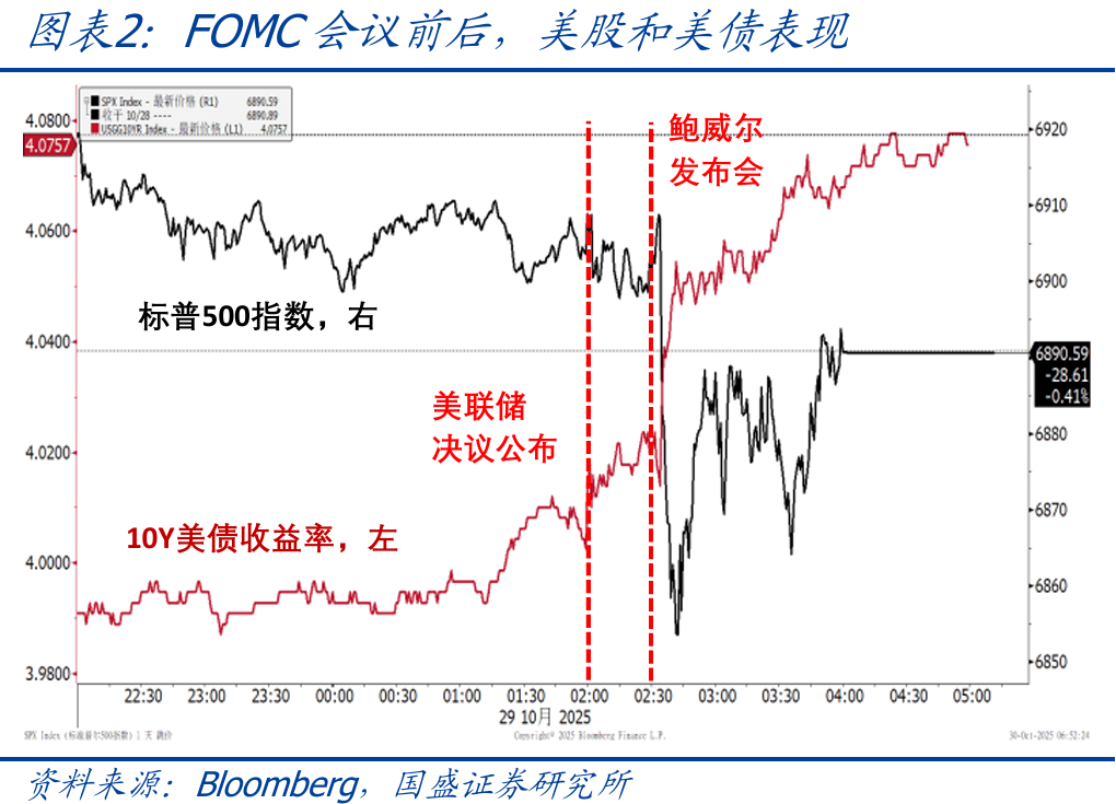 会议决议详情:美联储将联邦基金利率下调25bp至3.75-4.0%的区间,符合市场预期。同时,美联储宣布将于12月1日正式结束缩表计划,此后抵押贷款支持证券的赎回本金将被再投资于短期国债。与9月会议声明相比,本次声明对经济的表述由“增长放缓”调整为“温和扩张”,部分细节修改为“现有指标”、“截至8月”等措辞,主要原因是政府停摆导致部分数据延迟发布。值得注意的是,本次会议有2人投下反对票,其中米兰主张降息50bp,施密德则主张不降息,这反映出美联储内部的分歧进一步加剧。