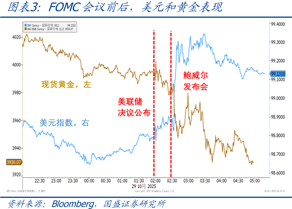 资产价格表现:会议过后,美股和黄金市场走低,而美债收益率和美元指数则走高。截至10月30日收盘,标普500指数收平,纳斯达克指数上涨0.6%,道琼斯指数下跌0.2%;10年期美债收益率上行9.8bp至4.07%,美元指数上涨0.4%至99.16,现货黄金下跌0.6%至3929.7美元/盎司。