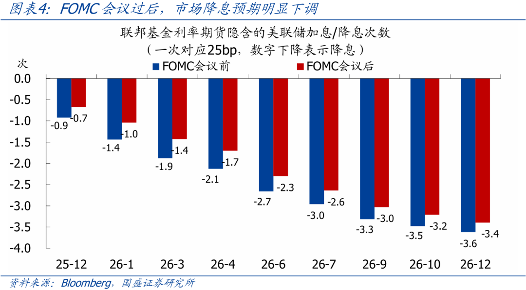 降息预期变化:会议过后,市场对美联储降息的预期明显下调。利率期货市场隐含的12月降息概率从超过90%降至不足70%,2026年底前剩余降息次数从3.6次降至3.4次。
