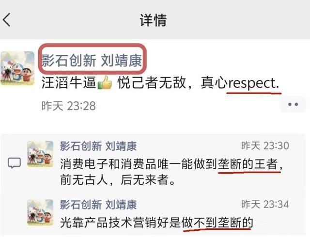 刘靖康在朋友圈写道:"汪滔牛逼,悦己者无敌,真心respect,消费电子和消费品唯一能做到垄断的王者,光靠产品技术营销好是做不到垄断的"。这条动态经截图传播后,在科技圈引发轩然大波。表面是赞美之词,实则因两次使用"垄断"一词,引发行业对大疆市场地位的深度解读。