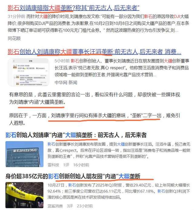 从商业竞争视角分析,这条动态暗含三层深意:首先通过"垄断"定位抬高对手行业地位,间接凸显自身挑战者的角色;其次借公众对垄断的负面认知,形成舆论压力;最后为影石后续市场动作铺垫战略语境。这种高明的商业话术,折射出深圳科技企业间日趋激烈的竞争态势。