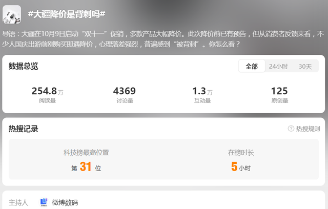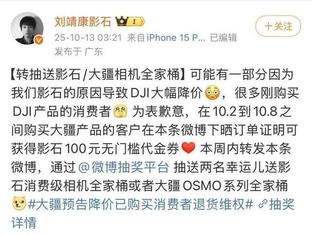 10月13日大疆降价引发退货风波时,刘靖康在微博发布耐人寻味的道歉声明:"可为有一部分因为我们影石的原因导致DJI大幅降价……为表歉意……在指定时间购买大疆的客户……可获影石100元无门槛代金券"。配以经典阴阳表情,这条微博引发科技圈热议,暴露出双雄竞争已从市场层面延伸至舆论战场。