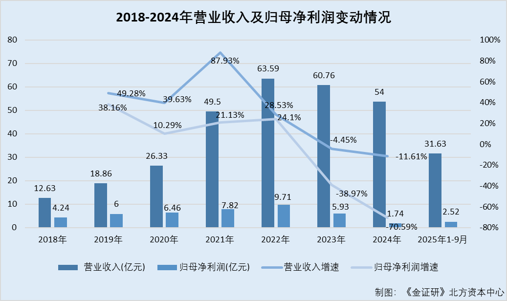 据华熙生物2019-2024年年报及2025年三季报,2018-2024年,华熙生物营业收入分别为12.63亿元、18.86亿元、26.33亿元、49.48亿元、63.59亿元、60.76亿元、53.71亿元,归母净利润分别为4.24亿元、5.86亿元、6.46亿元、7.82亿元、9.71亿元、5.93亿元、1.74亿元。