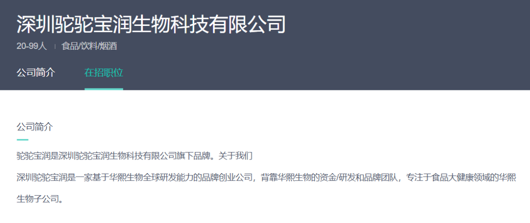 进一步研究发现,驼驼宝润在公开招聘平台自称系华熙生物子公司。