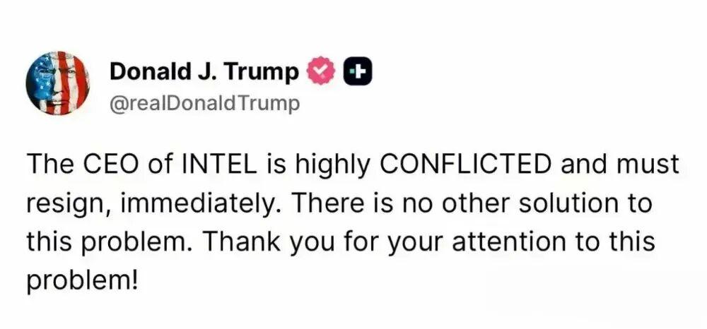 8月7日,路透社报道称,特朗普要求英特尔新任CEO陈立武立即辞职,理由是其与中国企业的合作存在“利益冲突”。然而,这一指控缺乏实质证据,更多被视为对英特尔的极限施压。