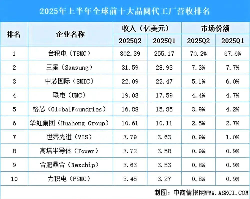 特朗普对英特尔的“关注”并非偶然。在AI时代,英特尔虽在芯片设计领域落后,但其晶圆代工业务对美国至关重要。2025年上半年全球十大晶圆代工厂数据显示,台积电以70.2%的市场份额居首,三星与中芯国际各占5%,而美国唯一进入前五的格芯仅占3.8%。