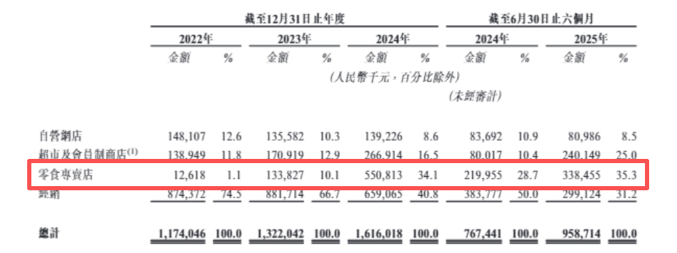 数据显示,2022年至2025年上半年,溜溜果园的渠道收入发生了巨大改变。其中,作为支柱的经销渠道的收入占比由74.5%降至了31.2%,而零食专卖店的收入占比由1.1%升至35.3%。