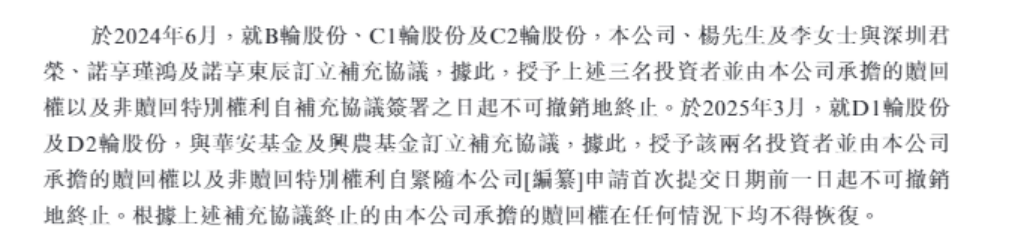不过,值得注意的是,或许是鉴于北京红杉回购对公司流动性造成的影响,溜溜果园不愿重蹈覆辙,溜溜果园分别于2024年6月、2025年3月,与B轮和C轮投资人、华安基金及兴农基金签订了补充协议,终止溜溜果园赋予其的赎回权和其他非赎回特别权利,且在任何情况下不得恢复。