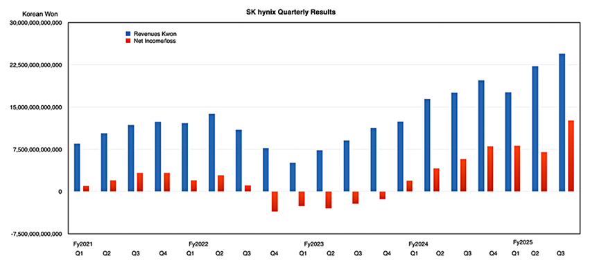 就韩国SK海力士而言,高带宽存储器(HBM)同样是一种高收入存储器。2025年第三季度,SK海力士收入为24.449万亿韩元(171亿美元),同比增长39%,净利润为12.598万亿韩元(88亿美元),同比增长118.9%。SK海力士每1美元的收入中,超过一半都是纯利润。其内部营业利润率首次突破10万亿韩元(约合70亿美元),创下公司历史新高。