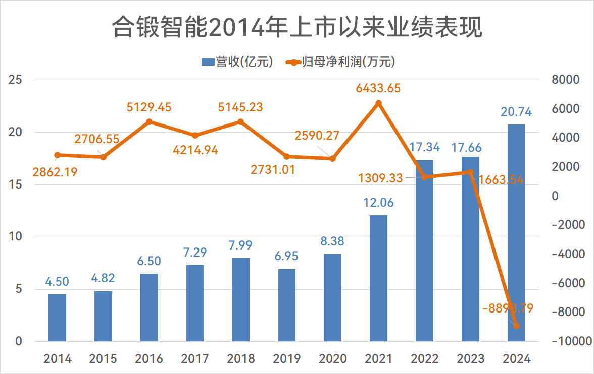 自上市后,合锻智能营收规模整体呈上升趋势,2014年底营收仅4.5亿元,2024年底营收升至20.74亿元。然而,公司净利润却未随着营收增长而同步增长,且始终未突破1亿元,2021年曾达到高峰6433.65万元,2024年底则首次亏损8898.79万元。