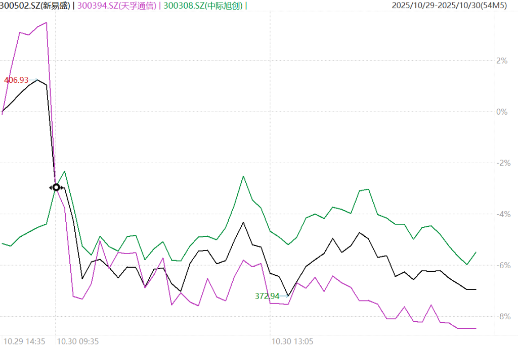 财报公布后的10月30日,新易盛与天孚通信的股价分别遭遇了7.9%和11.56%的重挫。而中际旭创,尽管当日股价也有所下跌,但跌幅相对较窄,显示出其较强的市场韧性。