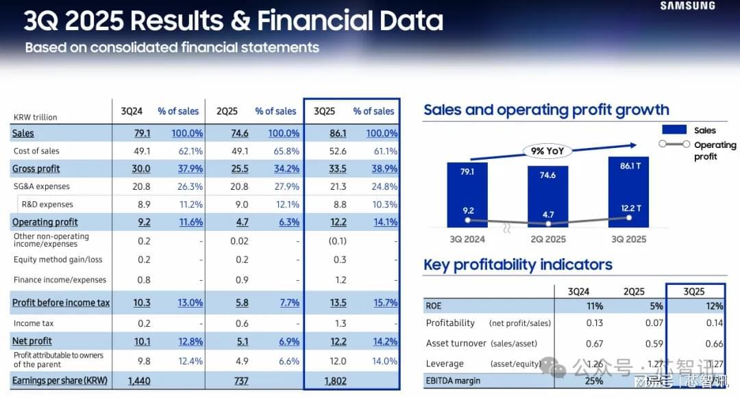 2025年10月30日,三星电子正式发布了截至9月30日的第三季度财报。数据显示,公司合并销售额达到86.06万亿韩元(约合606亿美元),同比增长8.8%,环比增长15.4%;营业利润为12.16万亿韩元(约合85.6亿美元),同比增长32.2%,远超分析师预期的10.1万亿韩元;净利润则达到12.22万亿韩元(约合86亿美元),同比增长21%。
