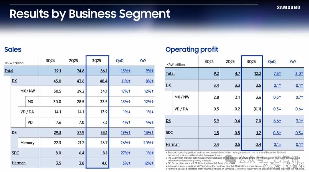 其中,2025年第三季度,由于旗舰智能手机销售强劲,以及Galaxy Z Fold7的强劲推出以及平板电脑和可穿戴设备销量的改善,MX业务的销售额和营业利润环比和同比增长。