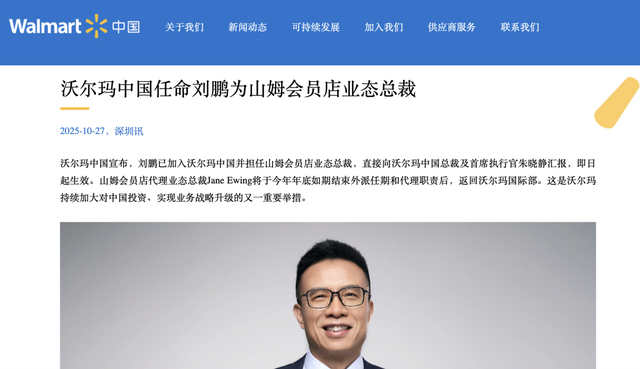▲ 刘鹏接任山姆会员店业态总裁。图 / 沃尔玛中国