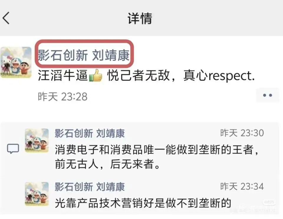 刘靖康在朋友圈表示:“汪滔牛逼,悦己者无敌,真心 respect。”随后在评论区话锋一转,直指其垄断。他认为汪滔是消费电子和消费品唯一能做到垄断的王者,前无古人,后无来者,并表示“光靠产品技术营销好是做不到垄断的”。