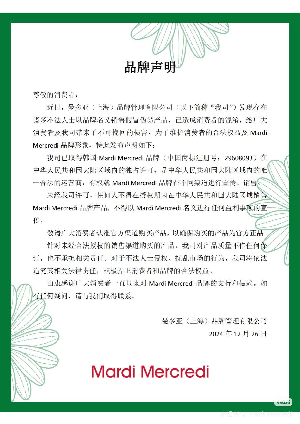 2024年12月Mardi Mercredi代理商曼多亚发表的声明。(图片截自品牌官方账号)
