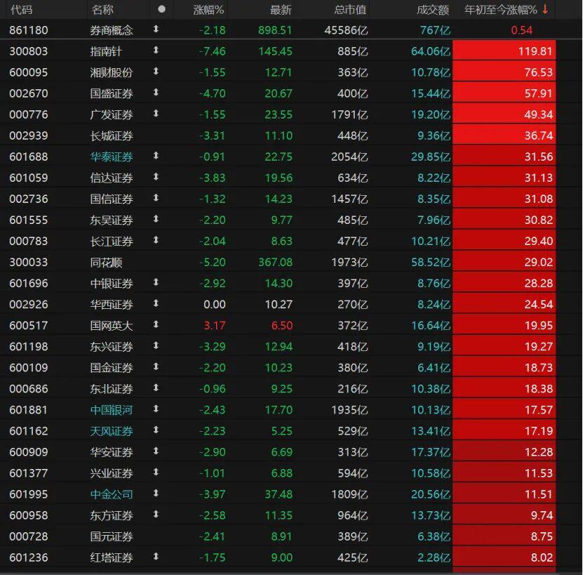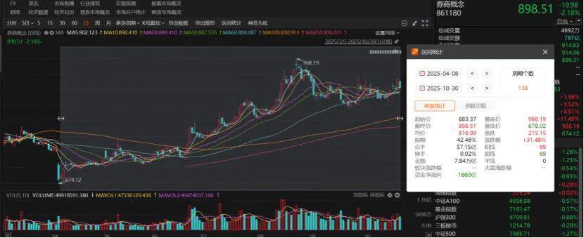 尽管券商业绩持续改善,但股价表现与业绩增速出现明显背离。10月29日券商概念股大涨后,10月30日随A股下跌跌逾2%;自4月8日以来,券商概念股累计涨幅虽超31%,但年内仅广发证券、长城证券等6只个股涨幅超30%,多数机构股价表现弱于大盘。