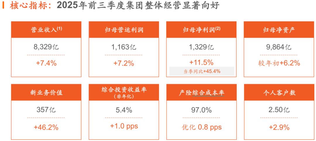 财产险业务保持稳健增长,前三季度原保险保费收入2562.47亿元,同比增长7.1%;综合成本率优化至97.0%,同比改善0.8个百分点。银行业务在风险可控前提下实现稳健经营,前三季度实现营业收入1006.68亿元,净利润383.39亿元;不良贷款率1.05%,较年初下降0.01个百分点,拨备覆盖率达229.60%。投资端表现亮眼,保险资金投资组合实现非年化综合投资收益率5.4%,同比上升1.0个百分点,投资组合规模突破6.41万亿元,较年初增长11.9%。