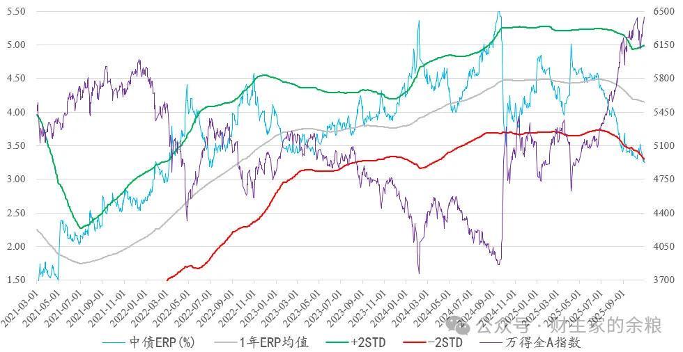 有读者提出,当时的国债收益率较高,而现在的国债收益率较低,因此应该采用全A的盈利率与无风险收益率之差,即股权风险溢价率(ERP)来进行对比分析。那么,我们就来看看全A指数的ERP情况。