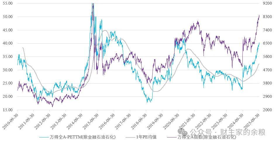 根据这张图,剔除金融石油石化后的全A指数当前估值已经超过了2021年年中的水平,接近2021年初和2020年7月份的高点,正朝着2015年的估值高点迈进。