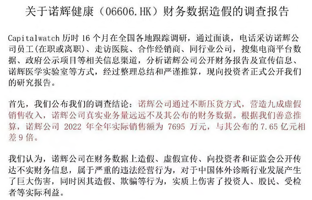 CapitalWatch在该文件中指控诺辉健康通过压货虚构九成销售收入,推算其2022年实际销售额仅7695万元。报告援引渠道调查称,该公司产品在医院、体检机构、电商平台等渠道的官方销售数据与其实际调查不符。
