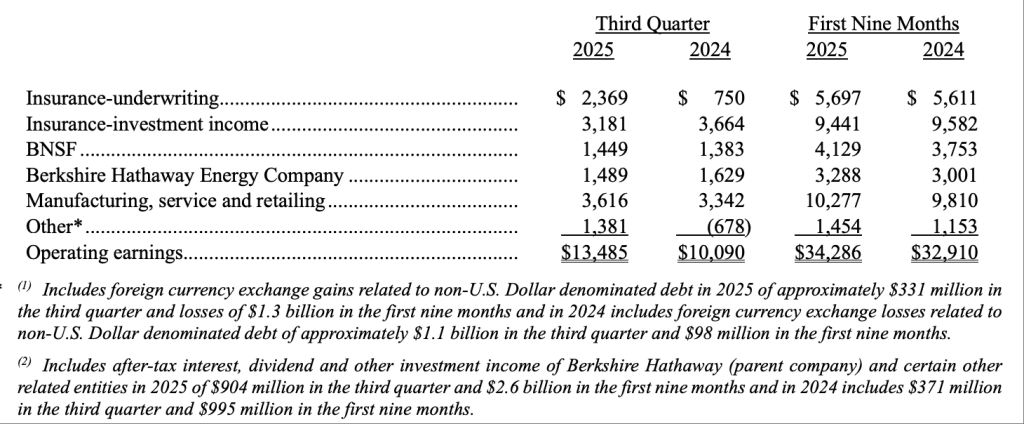 从业务板块来看,保险承保业务成为推动伯克希尔三季度运营利润增长的核心动力。财报显示,公司保险承保收益同比飙升200%以上,达到23.7亿美元;尽管保险承保业务收入同比下降13%至31.8亿美元,但利润贡献显著提升。铁路业务净利润同比增长4.7%至14.49亿美元,能源业务运营利润为14.89亿美元(同比下降8.6%),制造、服务和零售业务则以36.2亿美元的经营利润成为最大单一业务板块。