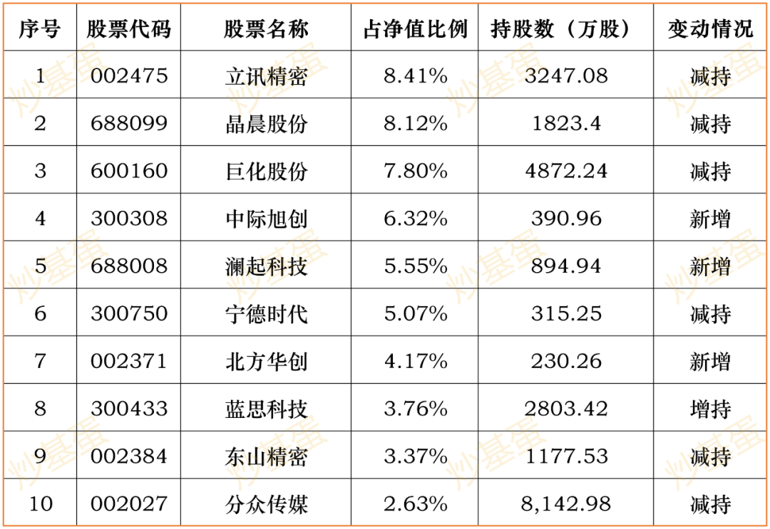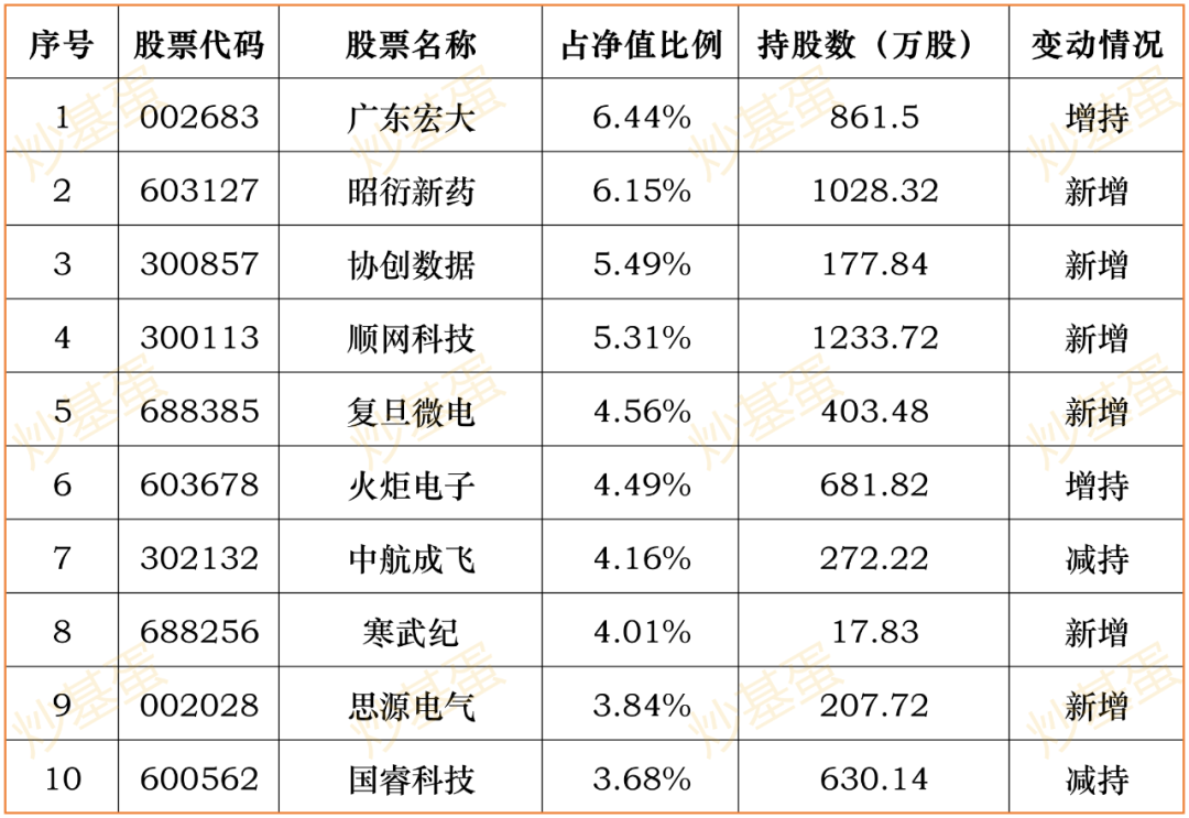 前十大持仓占比从49.77%微降至48.13%,新进昭衍新药等六只个股。该基金三季度涨幅25.61%,延续了其在科技领域的专业布局。