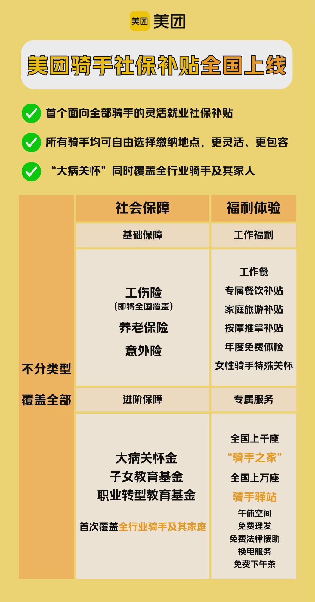 2025年10月27日,美团正式宣布养老保险补贴覆盖全国,向全部骑手开放。
