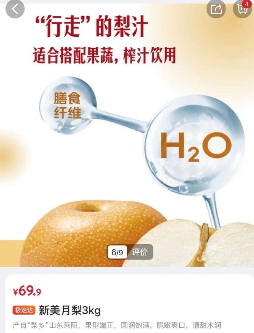 就比如出圈产品新美月梨,改版后展示产品的画面只能占四分之一,C位的是一个巨大的“H₂O”和膳食纤维图案,一个水分子比梨还要大吗?