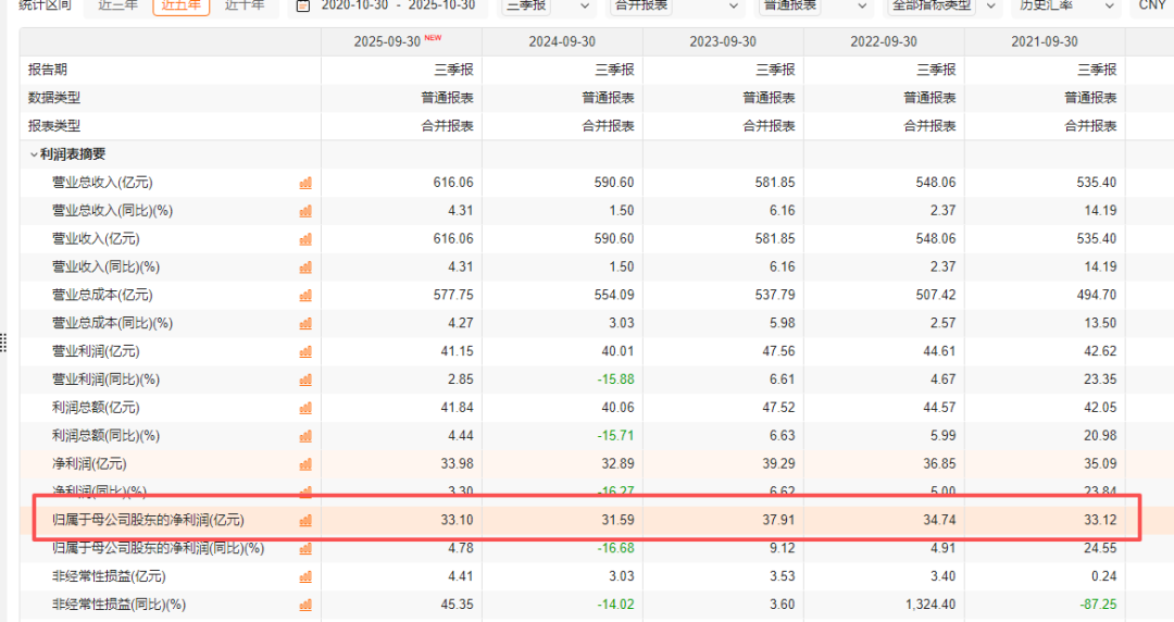 今年前三季度,白云山实现营收616.06亿元,同比增长4.31%;归母净利润33.1亿元,同比增长4.78%。乍一看,业绩似乎止住了下滑的势头。但深入分析数据,不难发现这份“增长”更多是基于去年低基数的反弹。与2022年、2023年同期相比,白云山的利润水平仍有较大差距,距离巅峰期更是遥不可及。