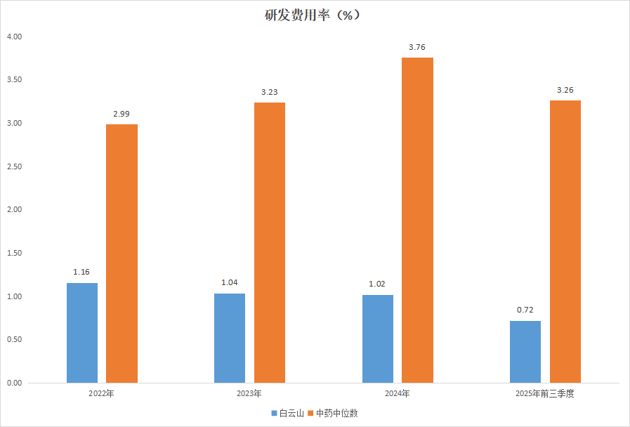 2022-2024年及2025年前三季度,中药行业的研发费用率中位数分别只有2.99%、3.23%、3.76%、3.26%,但这也大幅领先作为龙头的白云山。同期白云山研发费用率分别只有1.16%、1.04%、1.02%和0.72%。今年前三季度的研发费用率,居然连1%都没有。
